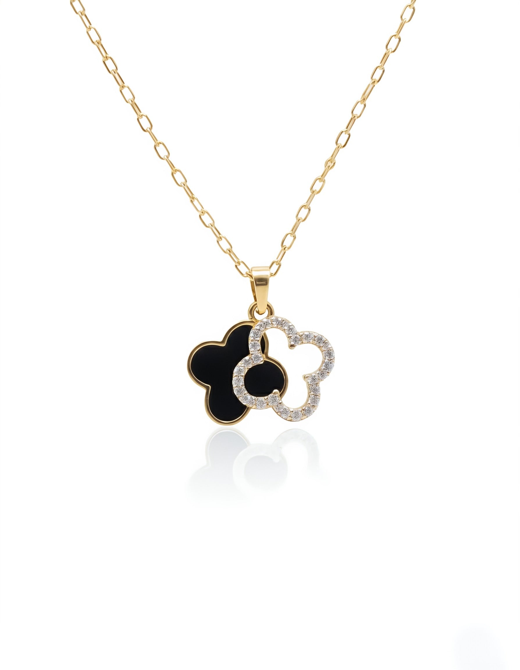 Elegant gold toned pendant with a double charm cluster hanging from a thin chain