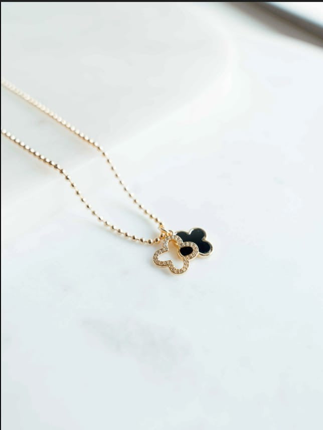Elegant gold toned pendant with a double charm cluster hanging from a thin chain